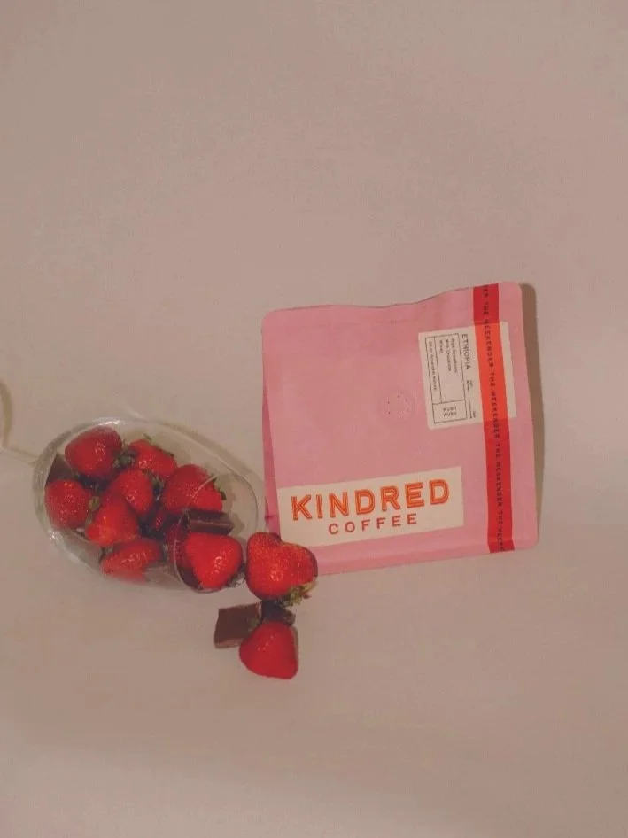 A clear plastic container of fresh strawberries, a pink bag of Kindred Coffee, and a small piece of chocolate on a pink surface.